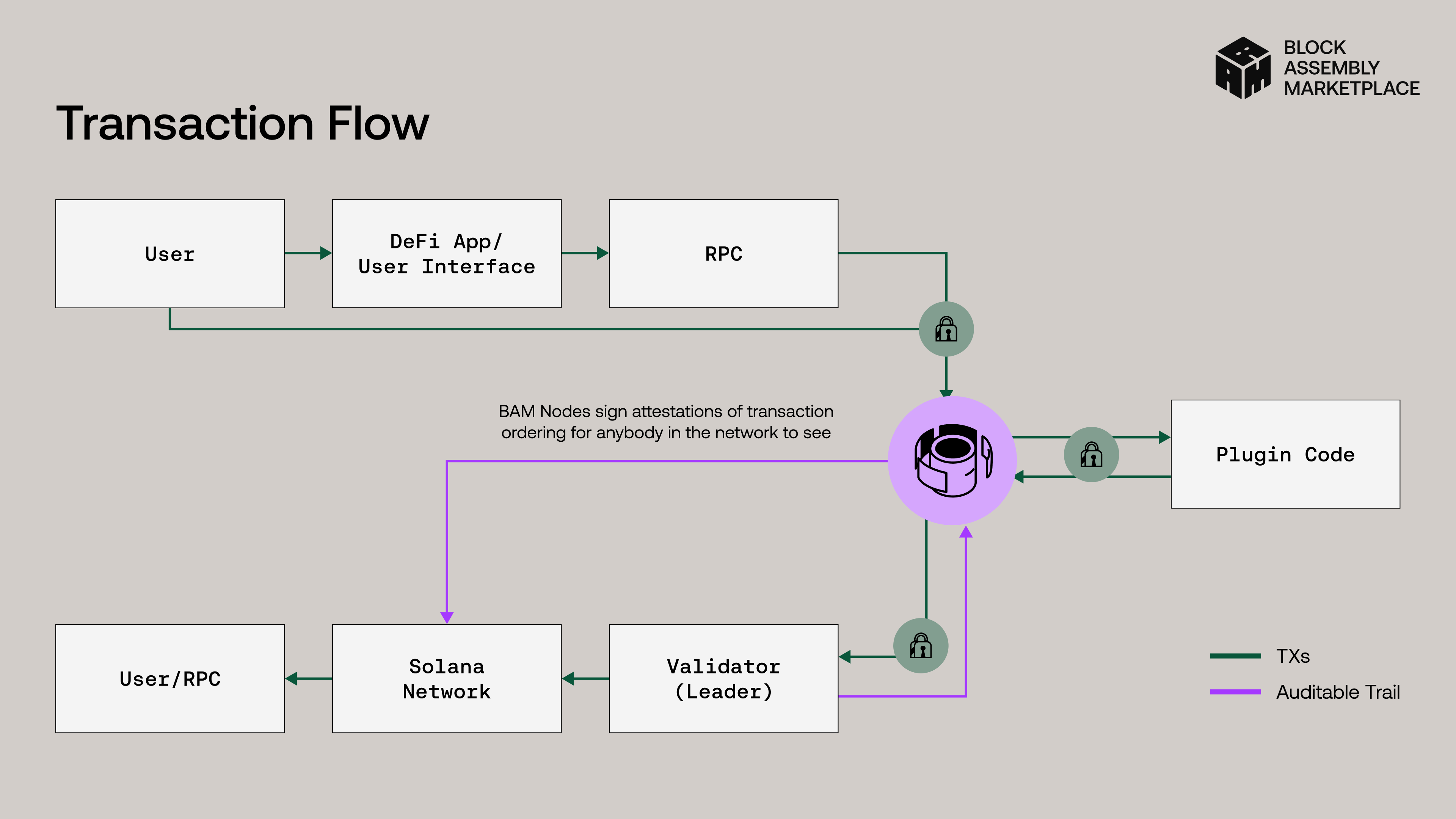 BAM processes a transaction by sending it first to a BAM Node, where it is filtered and ordered inside a Trusted Execution Environment. The node may insert transactions produced by a Plugin, then emits a cryptographic attestation of the final sequence.