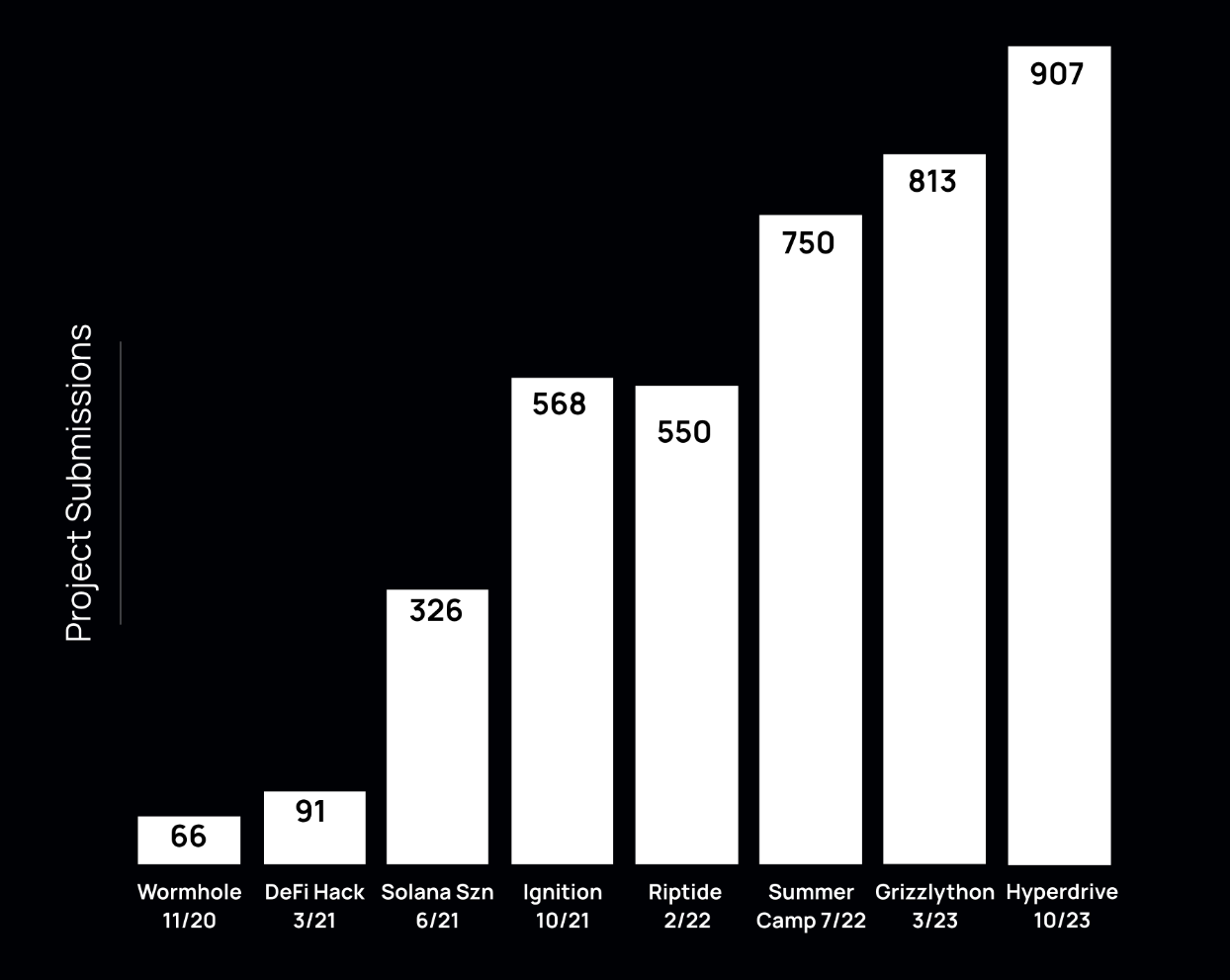 Solana’s hackathons started small, but have grown to be the largest recurring hackathons not only in crypto but in the entire technology space in terms of the number of participants, product submissions, and venture funding raised by winners. To give a sense of their impact, 80% of all venture-backed startups in the Solana ecosystem started in the online hackathons.