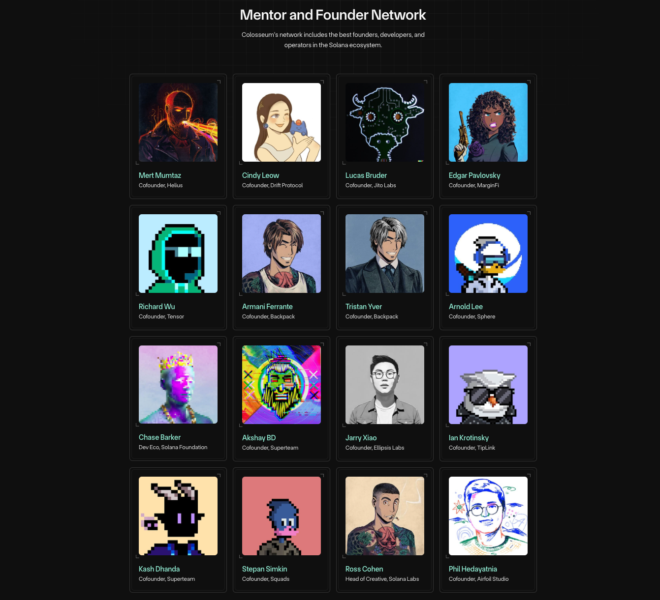 Beyond support from our team, Colosseum has partnered with leading ecosystem developers and founders, many of whom were previous hackathon winners. Founders will receive extensive mentorship and guidance during the Accelerator program, and become part of an exclusive founder community.